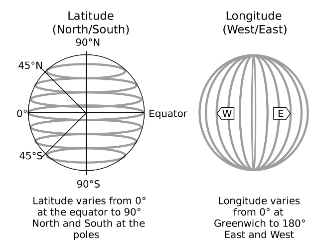 Latitude and Longitude. Source: Wikipedia, Public Domain.