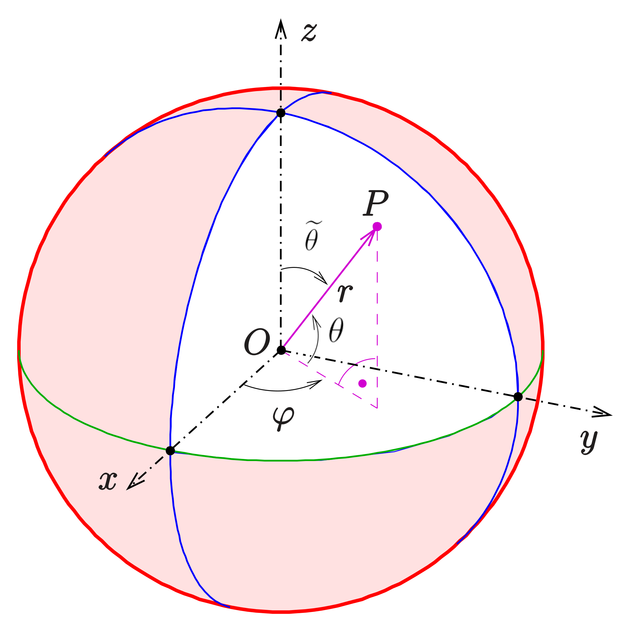 We consider the spherical coordinate system, in which all points in the three-dimensional space can be located using three variables: