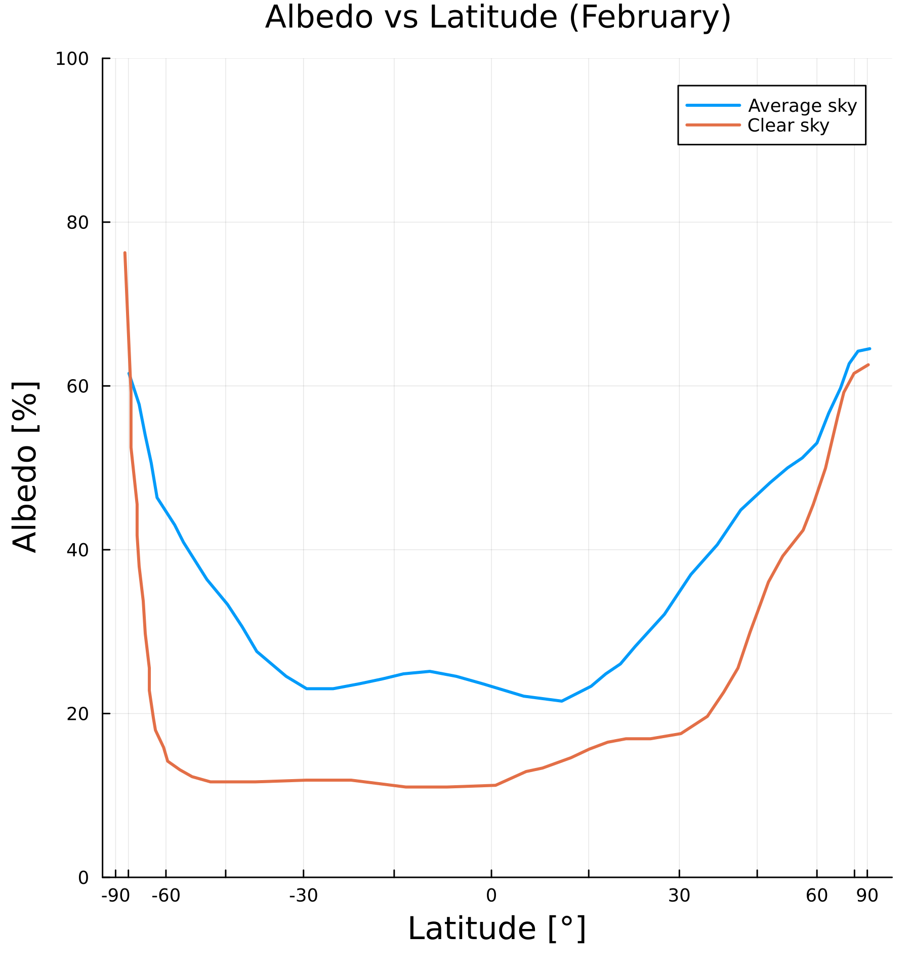 Data from Earth Radiation Budget Experiment (ERBE) of NASA Shows the observed background and albedo for different months. Note, that the x-axis is in fact in sinusoidal scale, rather than linear.