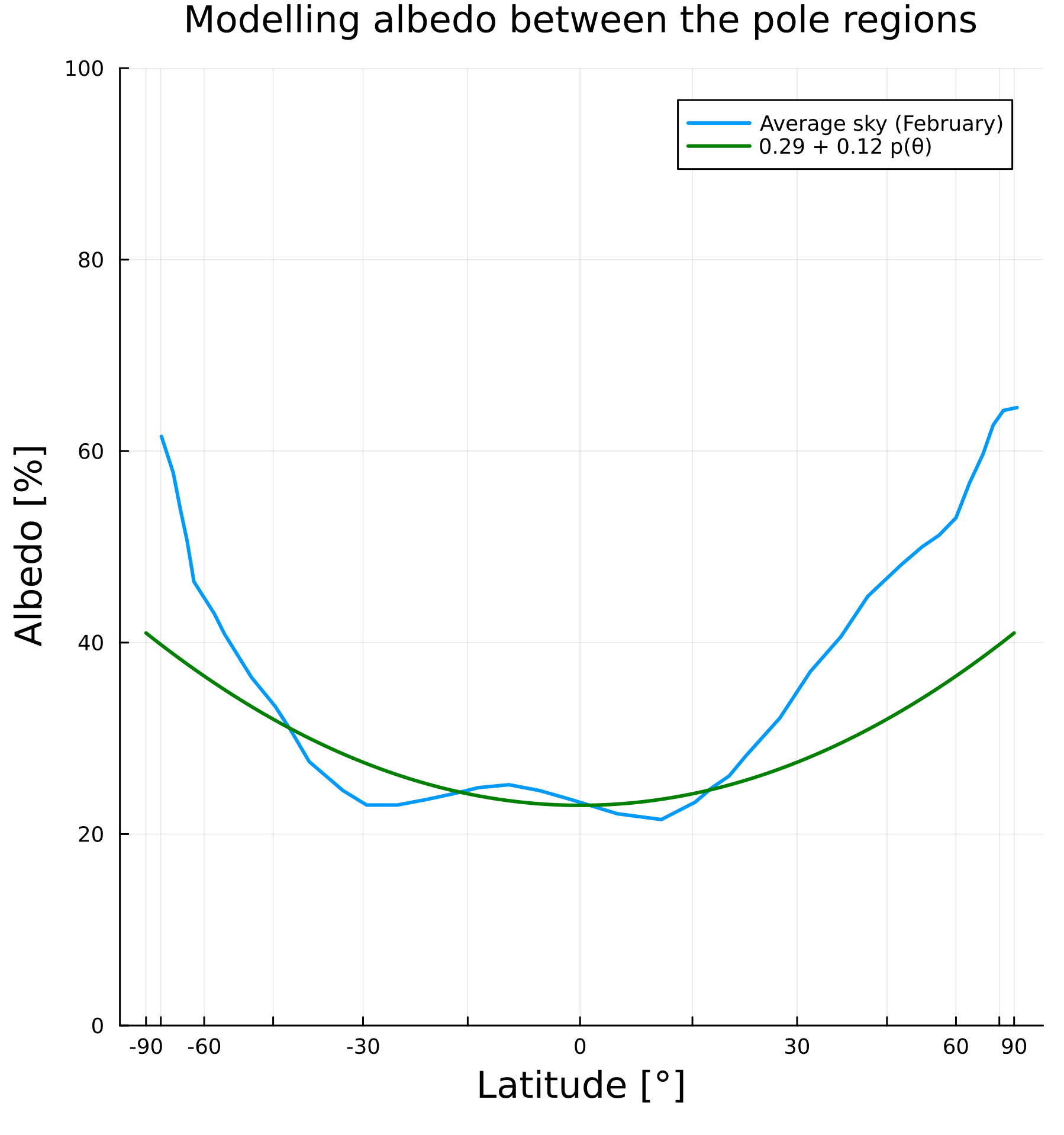 The following figures show that the albedo is dependent on the latitude (sine of latitude) and has almost a U-shape, with high values at the poles (ice and show) and low values at the equator. We do note, that typically, there is a discontinuity in the albedo when going from ocean/land to ice and snow due to the strong and sudden difference.