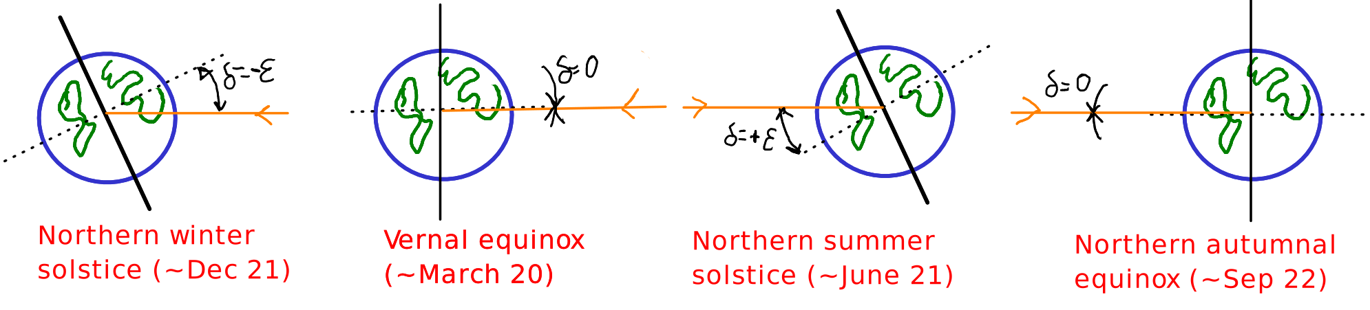 We call the angle between the Earth-sun line and the equatorial plane of Earth declination angle and note it with . This angle changes throughout the year, as the Earth revolves around the sun (see figure):