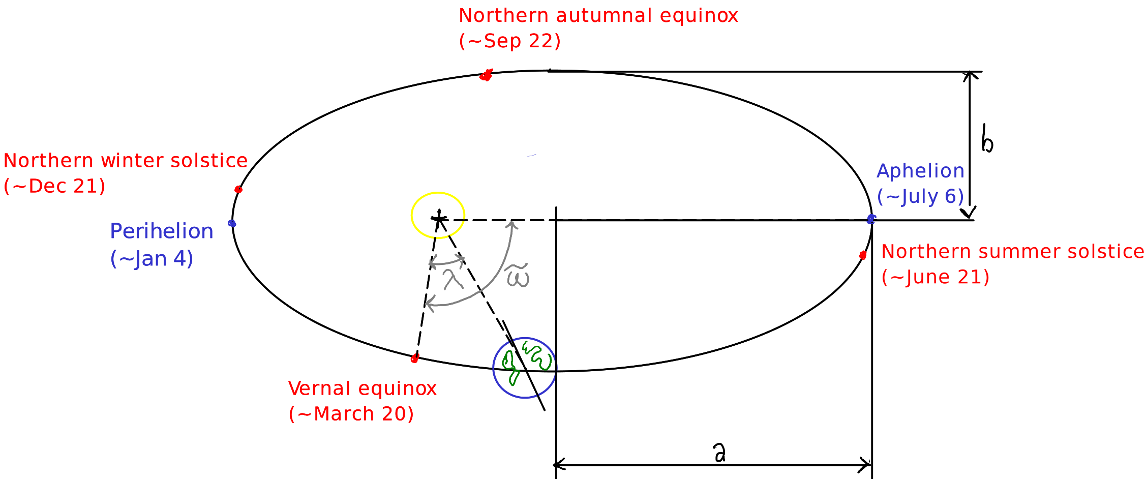 Precession distance (): Earth's axis rotates with a period of about years, causing the seasons to shift in position within the elliptical orbit of Earth. This phenomenon is known as precession or spin. We define the precession distance as the angle between the aphelion and the vernal equinox.
