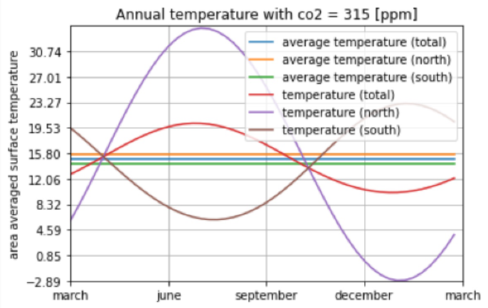 and is solved separately for each node. After solving the ODEs, we can then average the resulting time-dependent temperature field , over the whole globe, and/or separately for the northern and the southern hemispheres. The results are plotted in the next figure