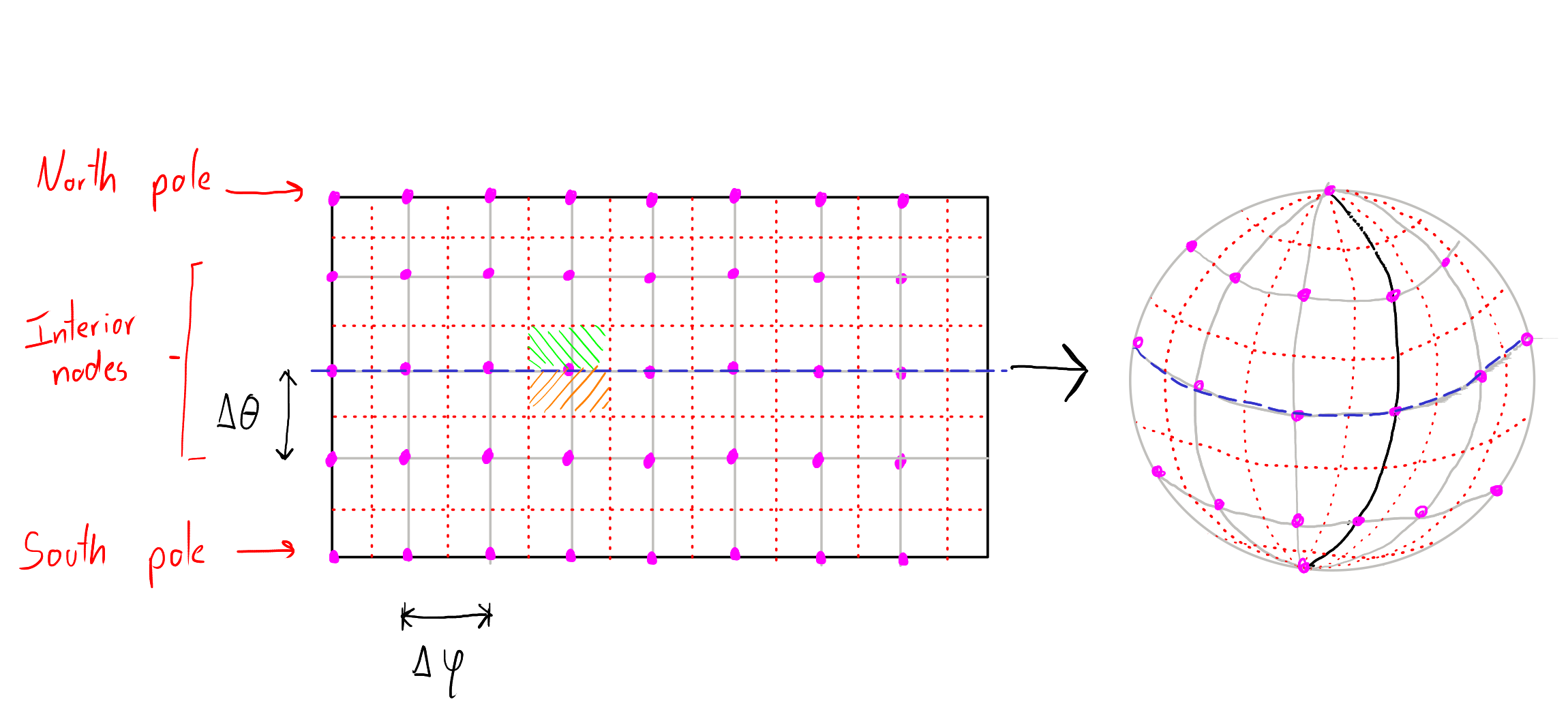 Let us assume that we have a 2D data field , with and , for which we want to compute an area average over the nothern hemisphere. We assume that we have our area vector , with , from milestone 3. With the assumption that along the longitude direction , all values at the north pole of are the same, we can compute the area average as