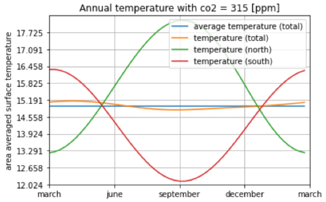 We can clearly see that the temperature distributions of north and south are phase shifted. It seems, however, that the phase shift in this simple model is mainly due to the seasonal difference of the solar insolation. There is no clear effect due to the difference in heat capacity visible. The average heat-capacities are and . If we check the maximum temperature variation in the hemispheres, we get and , which shows that a lower heat-capacity allows for a stronger variation in temperature. From our own experience about the annual seasons, it is clear that the seasonal temperature distribution from both, the North and the South, are still off. It seems that averaging our EBM first in the North and in the South, then compute the temperatures is too crude of an approximation to capture the seasonal temperature distribution accurately.