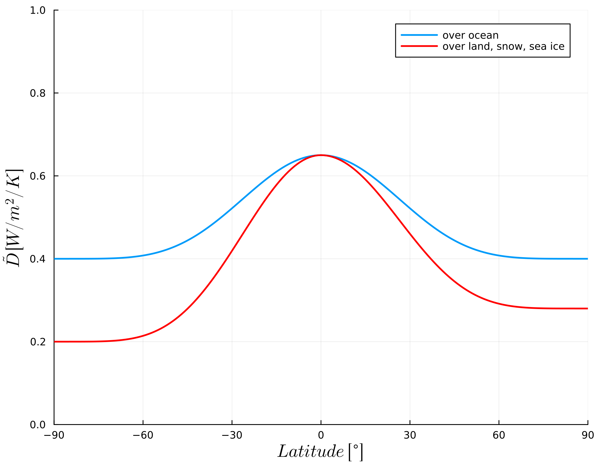 As discussed above, the heat diffusion term needs to model the complex mechanism of poleward transport of heat. There are many different choices of available in literature, from simple global constant values to more complex approximations. Here, again, we follow the paper by Zhuang et al.
