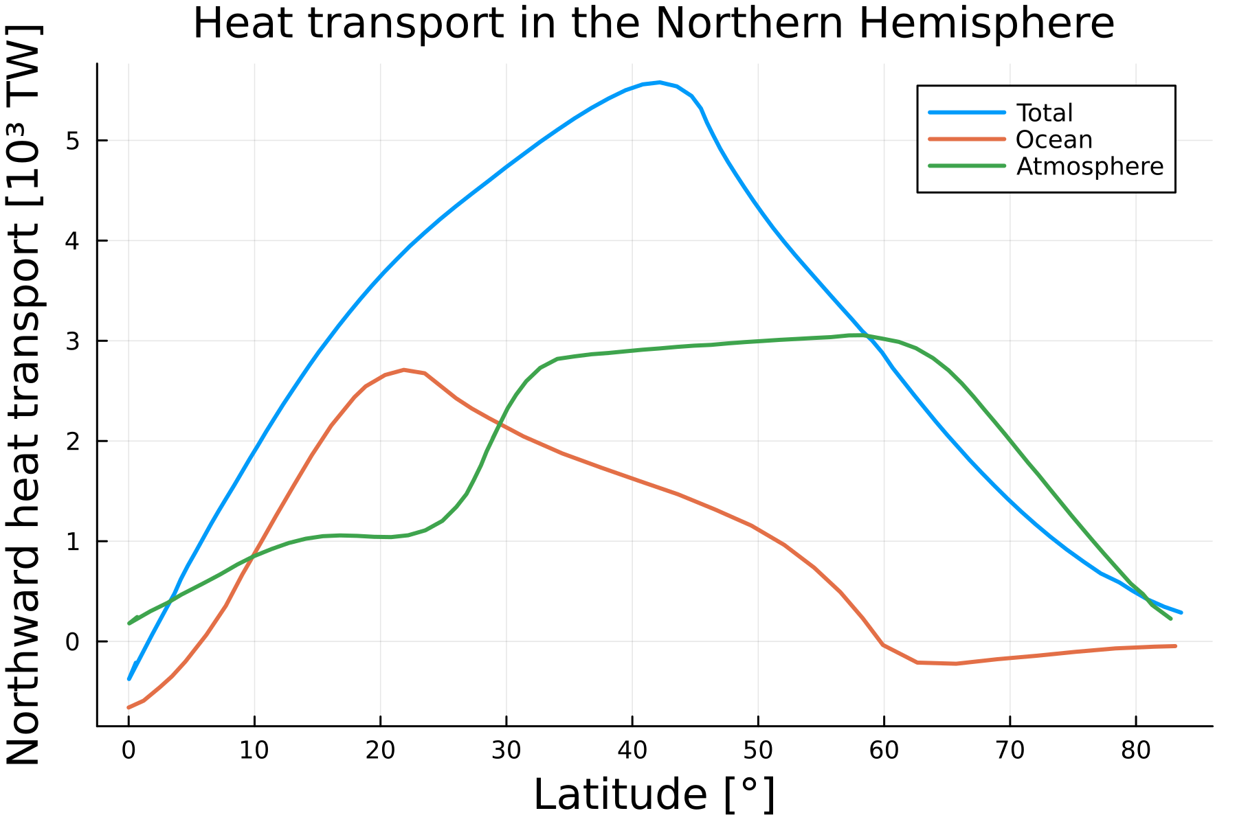 considered a simple 1D (latitude dependent) EBM that included a simple term that models heat transfer accross latitude zones. From satellite data one can reconstruct that the main heat transfer depends on the latitude and is polewards. The next figure, for instance, shows the heat transfer in the northern hemisphere. It is also worth noting that the heat transfer in the atmosphere is different compared to the ocean.