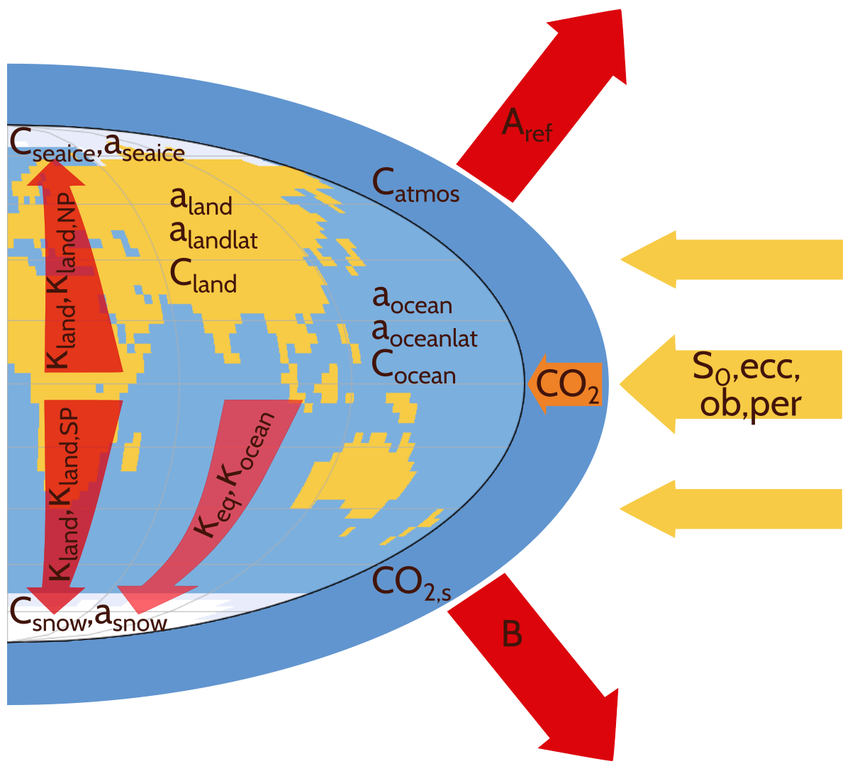 We distinguish between oceanic heat transport and heat transport over land and snow/ice covered areas. We also account for a difference of the heat transfer in the northern and southern hemisphere due to the asymmetric distribution and sizes of the land masses. The following figure shows a sketch of the energy fluxes due to heat transfer accounted in our model (here, the diffusion coefficients are denoted with instead of )