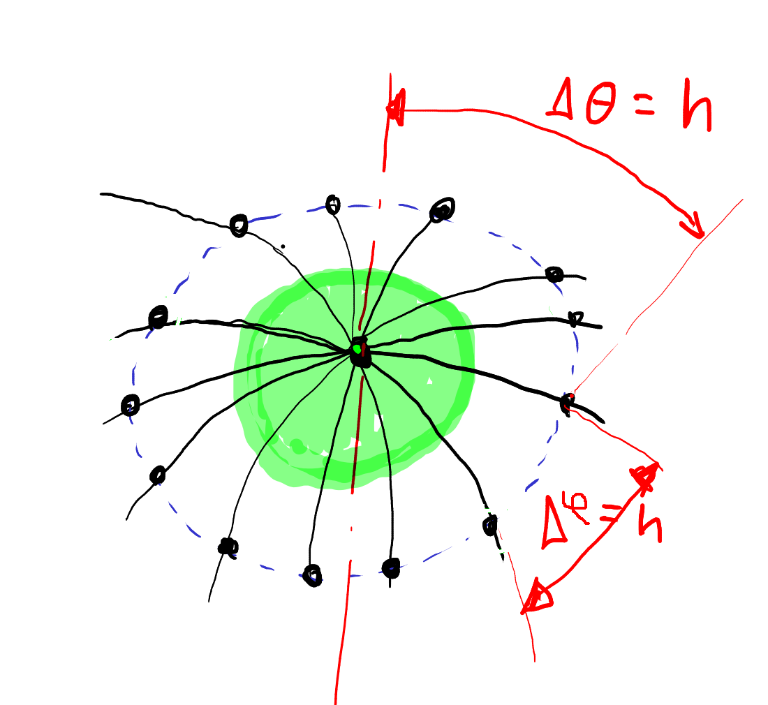 We will proceed to derive a discretization for the north pole. The discretization for the south pole can be derived in an analogous manner. Let us consider a control area of the size of the northern polar cell (green in the figure), which spans θ~∈[0,h/2], φ∈[0,2π].